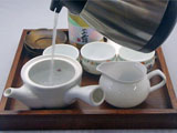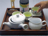 湯冷ましやマグカップ、又は大ぶりの湯のみ等に急須のお湯を入れ、湯を冷まします。お湯は移し替えるごとに約10度温度が下がります。温かい玉露をお好みの場合は、湯冷ましの工程を省いても結構です。低い温度程、抽出時間を長い目にとります。 |