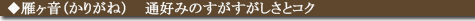 茶葉の茎の部分だけを選り分けたお茶を雁ケ音とよびます。雁ヶ音には独特のすがすがしい風味があるため、お茶通の方などに大変人気があります。また当店では、茎の中でも手摘玉露や上級玉露から選り分けた雁ケ音を白折と呼んでおります。 |